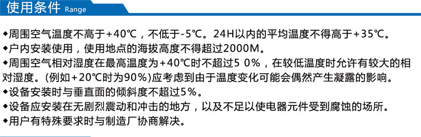 裝置適用于發(fā)電廠、石油、化工、冶金、紡織、高層建筑等低壓配電系統(tǒng)。海拔高度不超過1000m;周圍環(huán)境溫度-25℃ - +40℃;無導(dǎo)電性塵埃、腐蝕性氣體和水蒸氣的場(chǎng)所;無火災(zāi)和爆炸危險(xiǎn)的場(chǎng)所;無經(jīng)常性劇烈震動(dòng)場(chǎng)所。