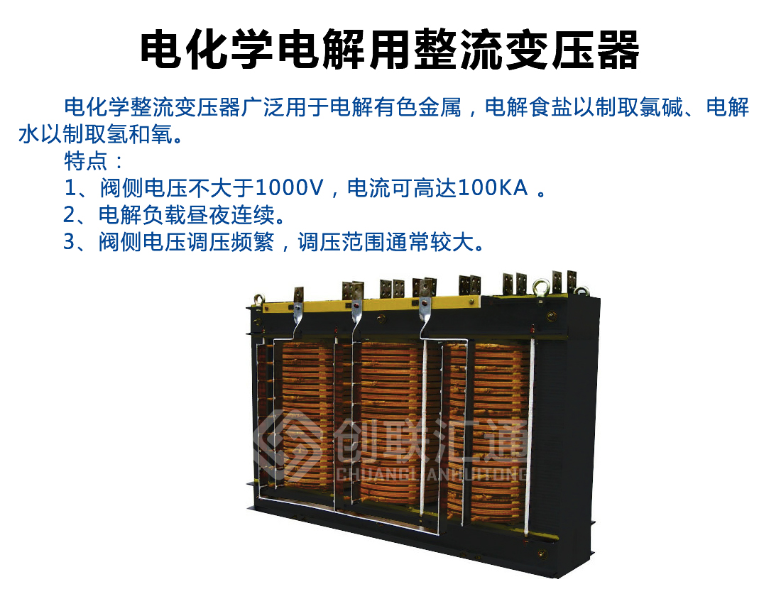 廣泛應用于電化學工業(yè),這是應用整流變最多的行業(yè),電解有色金屬化合物以制取鋁、鎂、銅及其它金屬;電解食鹽以制取氯堿;電解水以制取氫和氧等領域。